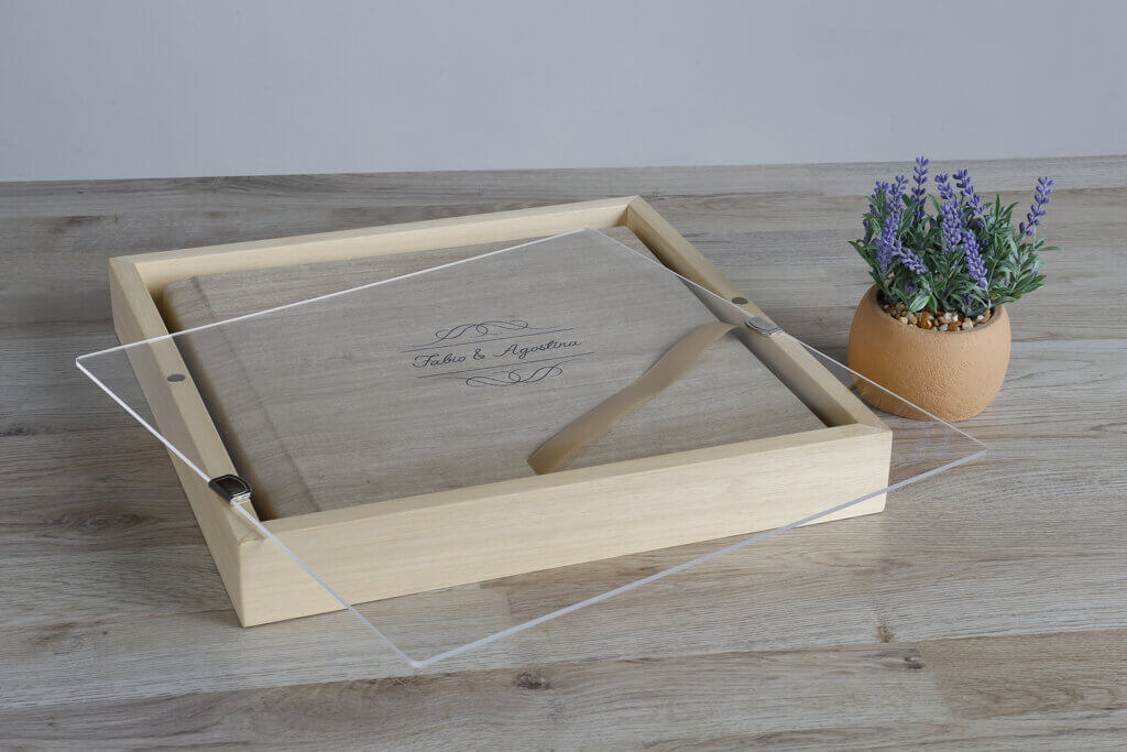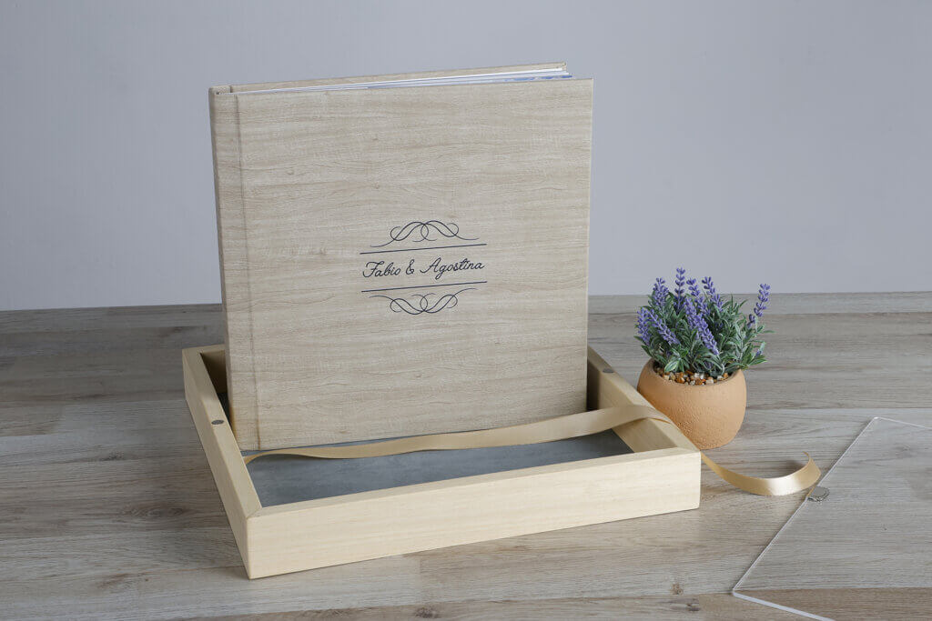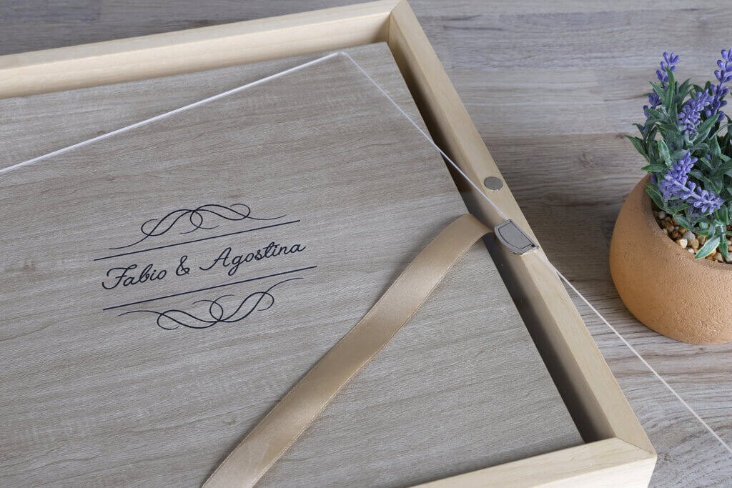 Scatola in legno rivestita in tessuto acero, divisa in due scomparti per ospitare foto 10×15 e penna usb (Stampa e Chiavetta Escluse)